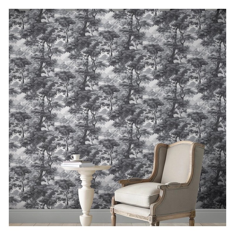 Colorway (Monochrome): The palette is a sophisticated blend of dove grey, charcoal, and muted stone on a soft off-white or pale grey background. By using "chiaroscuro" (the strong contrast between light and dark), the design creates a misty, three-dimensional effect that adds depth to a room without the "weight" of heavy color.