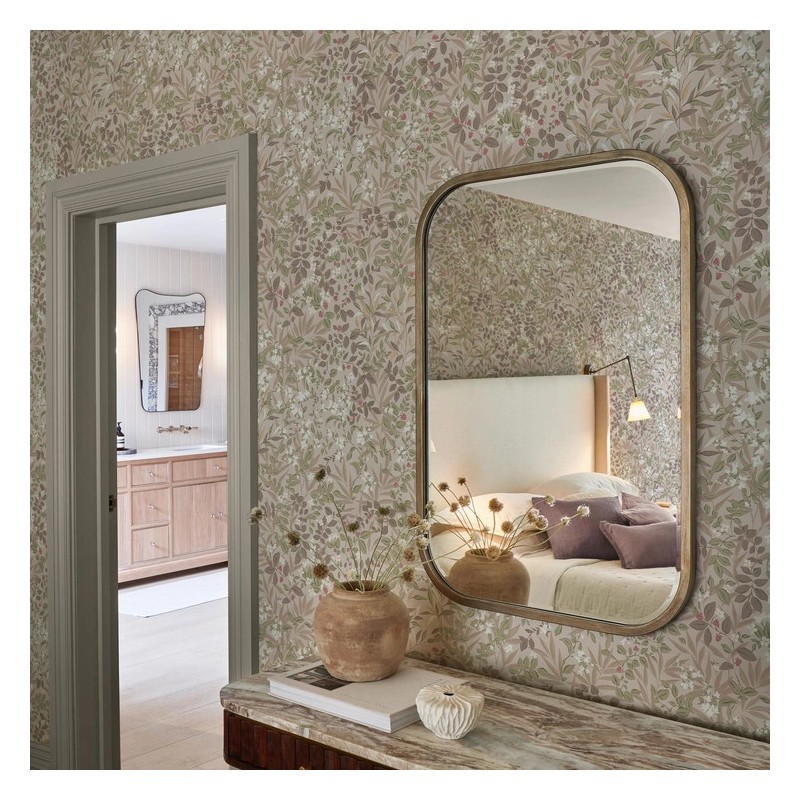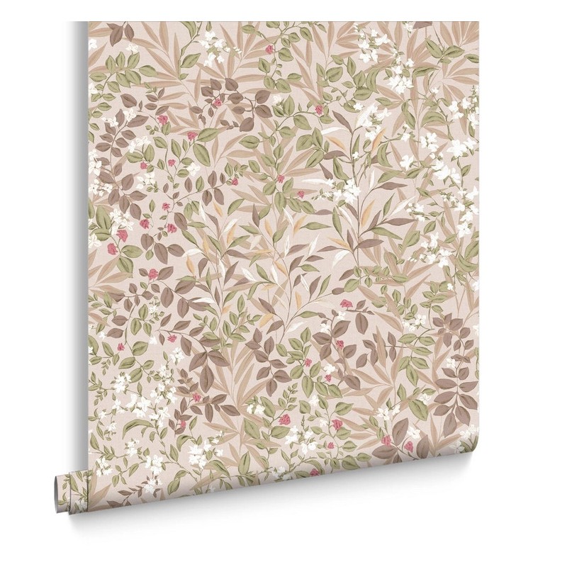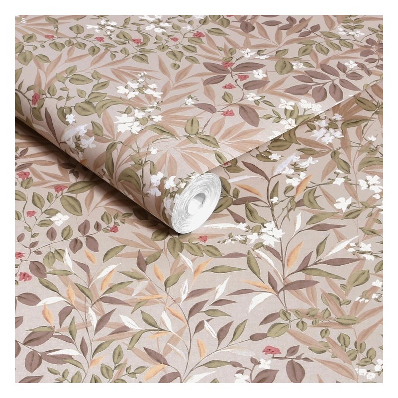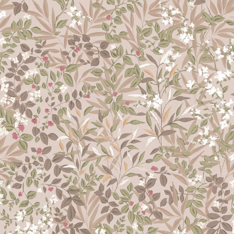 Colorway (Whispering Rose): The palette is centered around a warm plaster pink backdrop. The foliage is rendered in soft olive, sage, and taupe, which provides a natural, grounded contrast. The "Whispering Rose" elements come from the ivory blossoms and subtle blush and berry-toned petals scattered throughout the design.