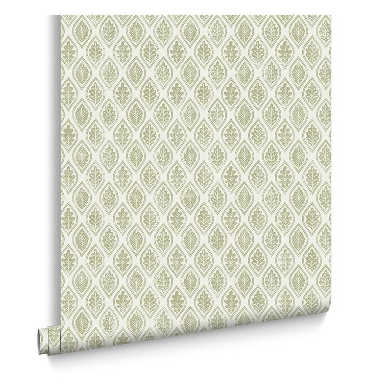 Pattern: This design features a soft, repeating leaf motif where each botanical element is neatly framed within a delicate, teardrop or diamond-shaped outline. It evokes the charm of traditional block printing, providing an organized but organic "rhythm" that flows across the wall.