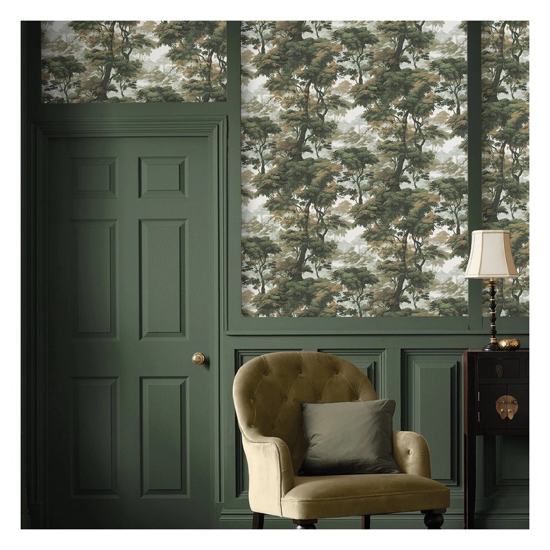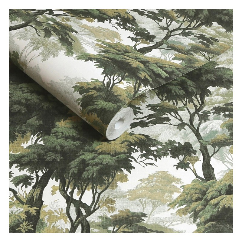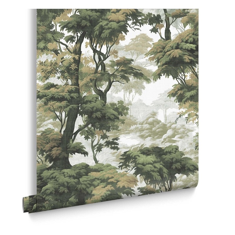 Pattern: This design features a sprawling, scenic forest landscape with tall, majestic trees. It utilizes a vintage etching style that gives the walls a hand-drawn, artisanal feel. The clever use of light and shadow creates a "misty" depth, making the forest appear to recede into the distance.